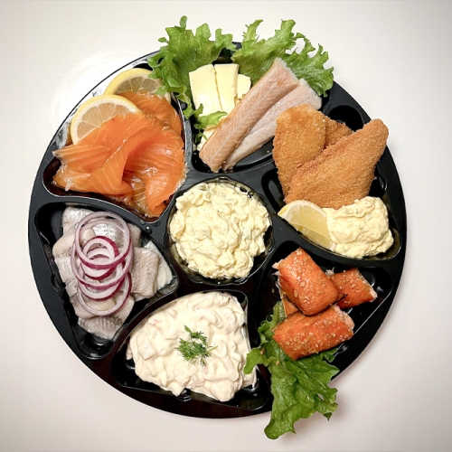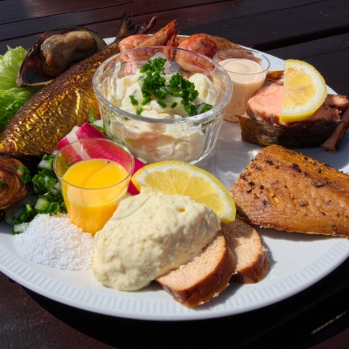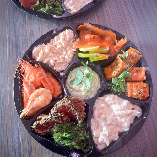 | Luksusplatte (3 personer) | Varmrøget og koldrøget laks, pil-selv rejer, lynstegt tun, tangsalat, krydderaioli, skaldyrssalat og rejesalat. | 249 kr |